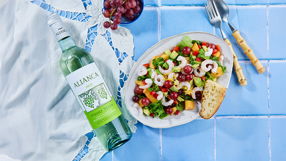 Hedelmäinen katkarapusalaatti & pirteä Vinho Verde